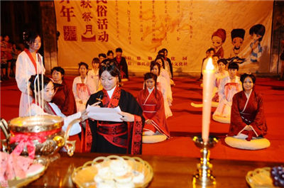 在月下,將月亮神像放在月亮的那個方向,紅燭高燃,全家人依次拜祭月亮,然后由當(dāng)家主婦切開團(tuán)圓月餅。切的人預(yù)先算好全家共有多少人,在家的,在外地的,都要算在一起,不能切多也不能切少,大小要一樣。